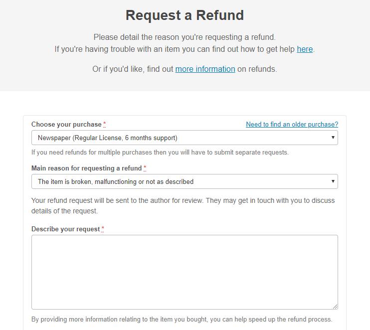 - 自己的描述,这个区域其实是我们主要填写的,因为数字产品不像实物,Themeforest的退款政策是很严格的,充分填写自己的理由,比如主题有质量问题,就详细说明主题错误以及给自己带来的不便。总之,越详细退款的成功率就会高一些