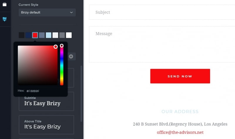 Brizy中的全局配色一个非常强大的功能,在所有元素的调色板中,你都可以自定义或者从全局颜色中挑选一个,这样做的好处,一是你不需要每次都去寻找特定的色值,只要从面板中勾选即可,二是当你想切换所有之前的颜色,只需要修改全局颜色即可