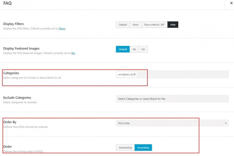 在调用界面,有非常多的FAQ选项,关于内容方面主要有2个要设置,一个是FAQ分类,还有就是FAQ列表的排序,建议大家使用FAQ Order,这个选项的意思就是根据FAQ页面里的一个排序选项决定的,我们可以随时更改排序,然后用下面的Order决定正序还是倒序