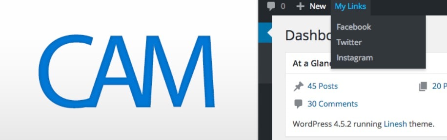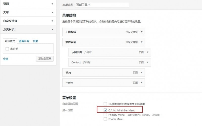 这款插件使用非常简单,安装好之后你会在WordPress菜单栏看到一个多出一个名为 C.A.M:Adminbar Menu 的菜单位置,你可以将任何菜单放到该位置,然后该菜单就会显示在工具栏中,包括二级甚至三级菜单,你都可以添加