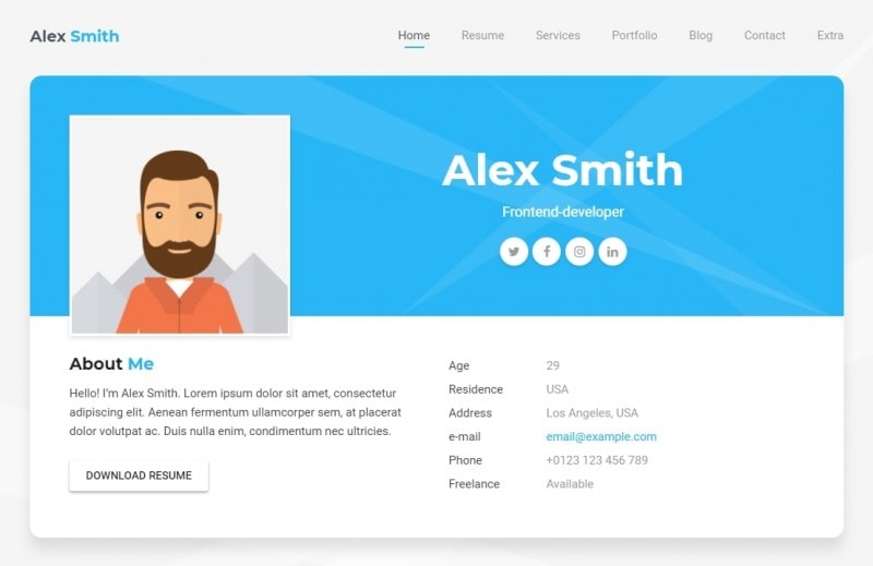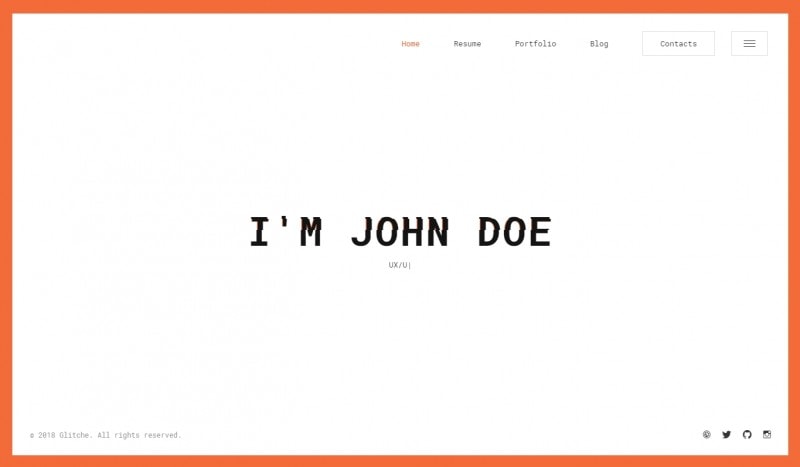 Glitche 是一款非常有特色的简历模版,尤其是页面顶部会有一个动态的标题,可以给人留下非常深刻的印象