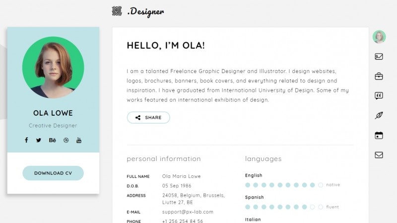 Certy 是一款标准的个人简历、电子名片主题,它在左侧展示个人头像,右侧是滑动的简历内容,包括个人信息、经历、项目展示、博客等内容,而且它提供了很多配色和风格选择,适合多种行业的使用