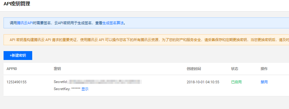 新建一个密钥,然后就会得到 secret_id 和 secret_key