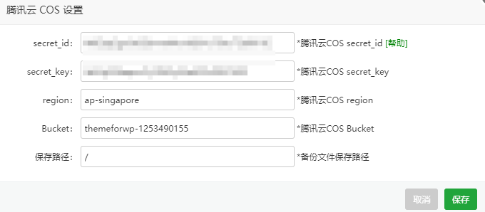 然后到宝塔面板填入刚刚的id和key,rergion 和 bucket 可以到腾讯云存储桶基础配置中查看,region就是地区,使用英文名,bucket 就是存储桶名称