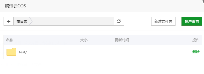 保存之后会进入到一个空的文件夹,这个文件夹就是我们刚刚创建的存储桶,你可以通过创建一个测试文件夹来测试是否连接成功