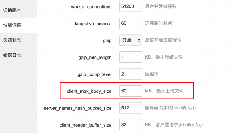 选择性能调整,其中有一个选项叫做 client_max_body_size,表示最大上传文件,将其调整为你需要的最大数值即可