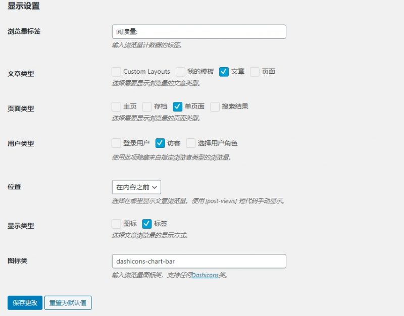 比如在上图的设置中,你可以设置显示的范围、统计的范围、显示位置、图标定制等,保存后它会自动为你添加到文章中