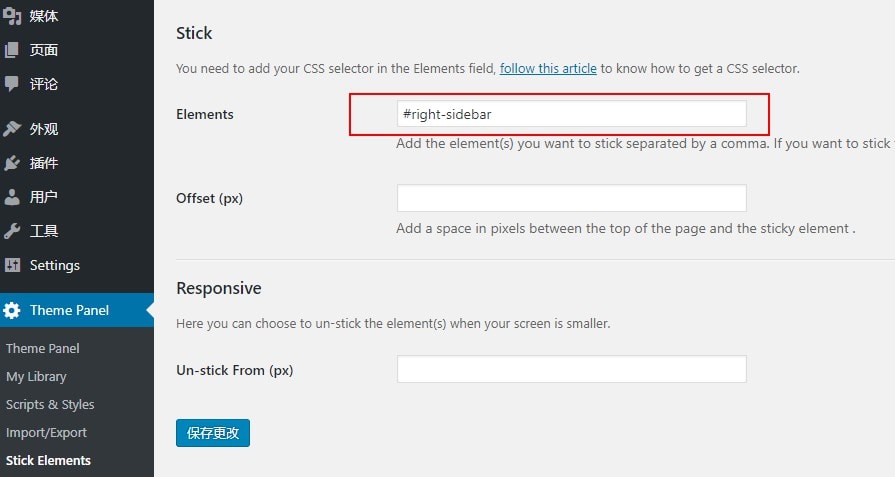 插件的使用也非常简单,你只需要在Elements栏目中填入需要浮动区域的CSS类即可,可以使用ID或者类,比如想要整个侧边栏浮动就可以填写 #right-sidebar,或者填写其他的类,不过这款插件也有一个缺点就是不能同时浮动2个元素,建议整个侧边栏设置浮动,这样设置起来简单,效果也比较不错