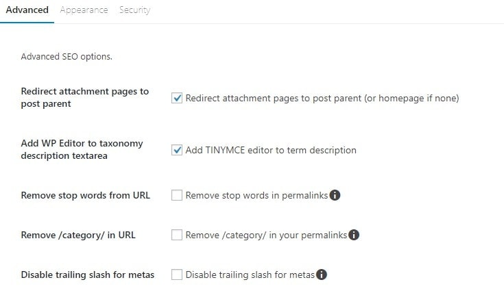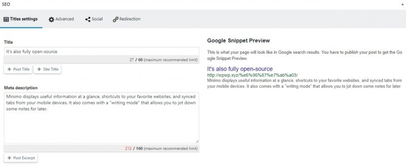 文章页是最重要的SEO流量来源,所以文章中的SEO设置格外重要,在初始设置中会看到文章标题和描述的设置,在不设置的情况下会摘录文章标题和前边的字符。它的高级选项,提供了非常多的标签选用,比如noindex、nofollow、noimageindex等,还可以结合Redirection,重定向到其他页面