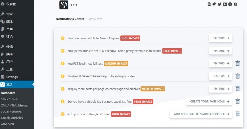 打开SEOPress插件页面,会看到一连串的SEO建议,它会帮助你检测网站当前存在的SEO问题,并根据优先级用不同的颜色表示,如果是红色的表示该问题需要立即解决,黄色的则不是那么重要