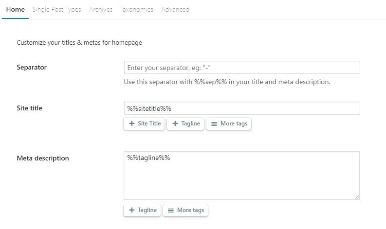 Titles & Metas,这里主要是设置标题和描述的格式,里面提供了非常多的设置,比如首页标题、列表页、文章页格式等,可以使用变量来组合,不过在文字框中的一般不需要修改,这里我们可以利用的是 noindex 指定的页面,比如标签页、媒体页面等,防止出现重复内容