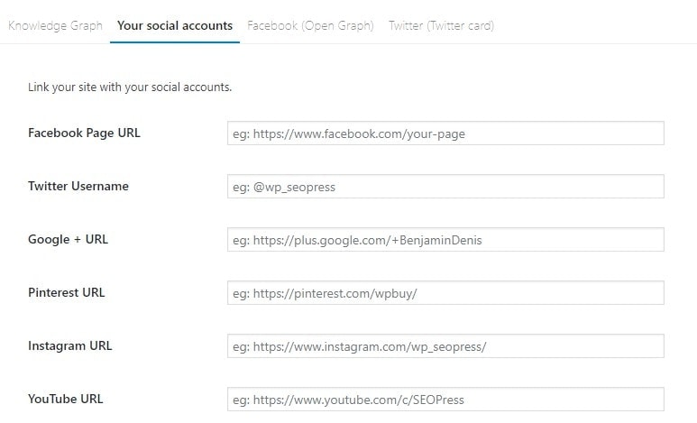 在社交网络设置中,SEOPress可以让你设置谷歌资料,把各种社交账号和网站关联起来,还可以设置Facebook和Twitter card