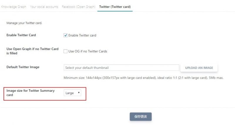 可以看到最后一项叫做 Image size for Twitter Summary card,也就是推特卡片的尺寸,我们将其设置为Large即可使用大图
