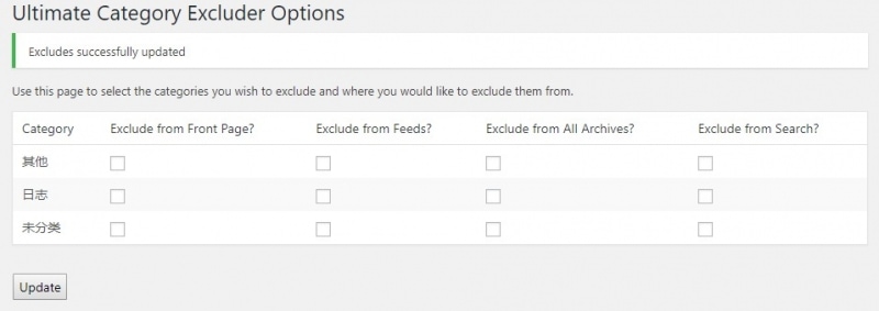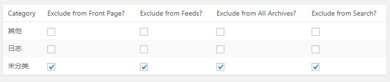 安装好插件后,你会在设置中看到一个叫做Category Excluder的选项,非常清晰的管理列表,他们分别是从首页排除、从RSS中排除、从归档页排除、从搜索结果中排除