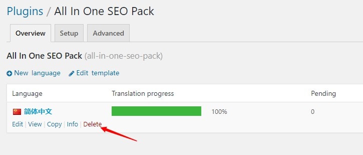 在插件翻译界面,找到简体中文选项,选择 Delete