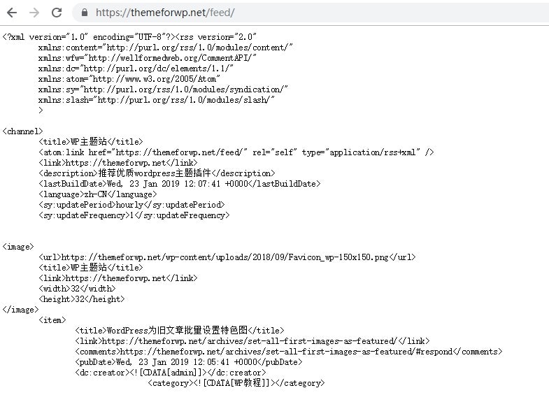 在WordPress系统中,默认已经为我们开启了RSS功能,你只需要打开自己的网站并在后边加上 feed后缀即可查看自己站点的RSS信息,比如WP主题站的RSS地址就是 https://themeforwp.net/feed/