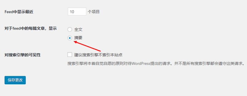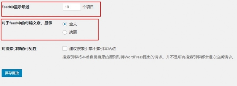 这里面有2个重要的选项,他们的作用分别是设置RSS中显示的文章条目和RSS文章是否完全显示
