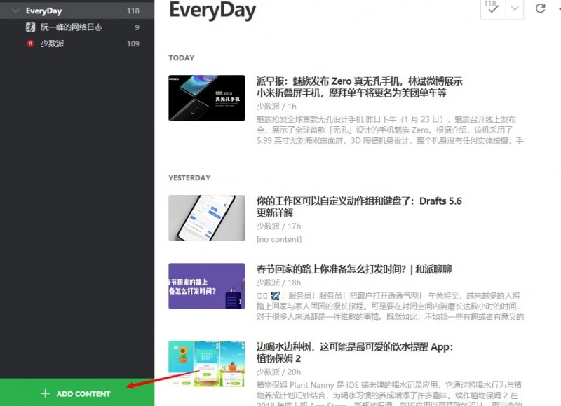 打开Feedly之后,点击最下方的 ADD CONTENT按钮
