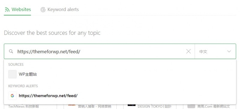 在搜索框中输入WordPress的RSS地址,然后点击Follow即订阅了对应的网站