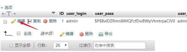 打开users表之后一般就会看到管理员用户了,选择管理员,点击前边的编辑按钮