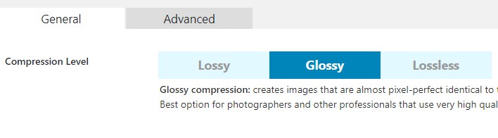 可以看到在设置界面,同样是提供了三种不同精度的图片压缩方式,Lossy(有损压缩)、Glossy(高质量压缩)、Lossless(无损压缩),可以根据需要进行选择