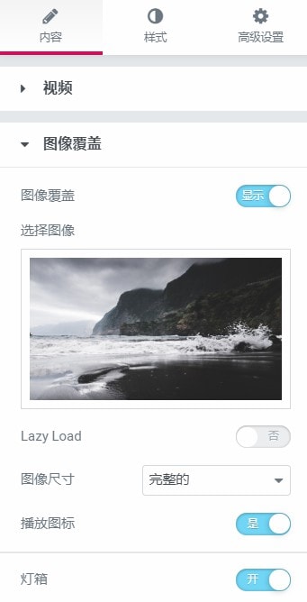 视频组件默认的控制栏中式没有灯箱选项的,我们需要打开下面的名为图片覆盖的标签