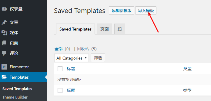 打开新站点的Elementor Templates,选择导入模板,上传导出的json文件