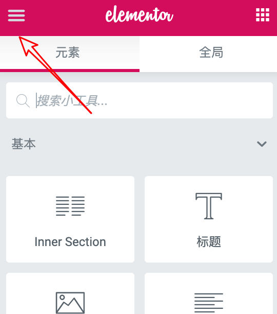 打开Elementor编辑器后,点击编辑栏左上角的汉堡菜单