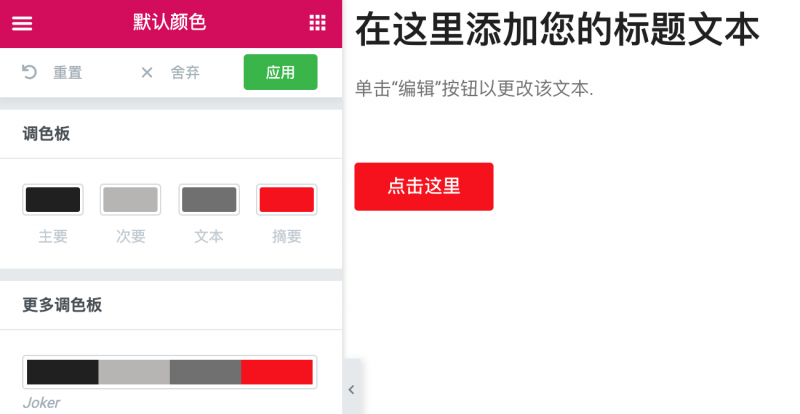 在Elementor中,所有元素的颜色设置都可以使用颜色选择工具,而颜色选择工具中默认的几个色彩对应的就是这8个颜色