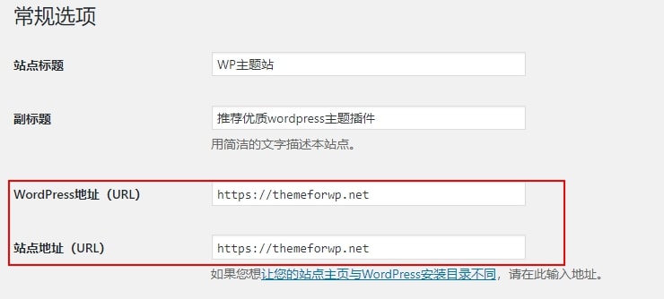 修改 WordPress地址 和 站点地址 为 https 格式,比如WP主题站的地址就写为 https://themeforwp.net/