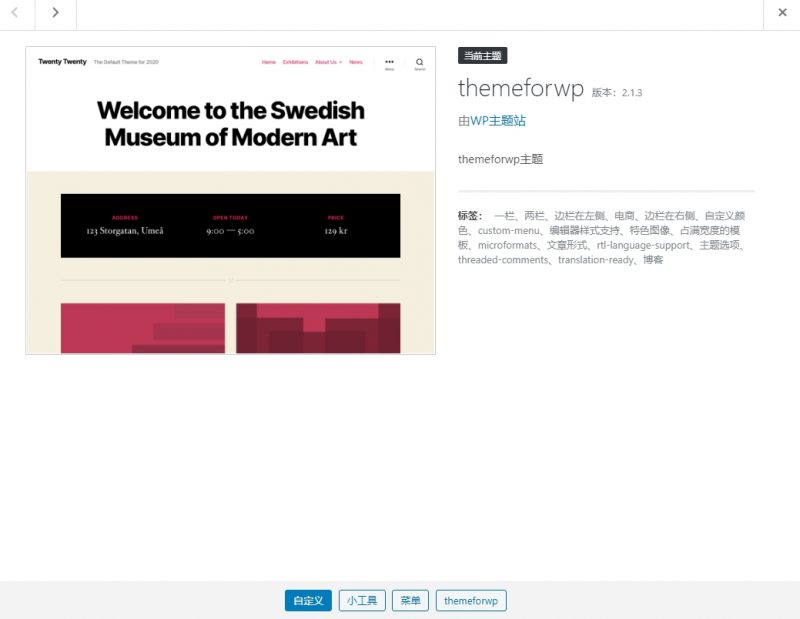 主题区域也会被修改,包括主题名称、主题作者链接、主题描述、特色图等都会被替换