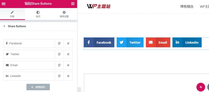 点击社交元素,即可管理分享按钮,可以通过面板添加、删除、调整已有按钮的排列顺序