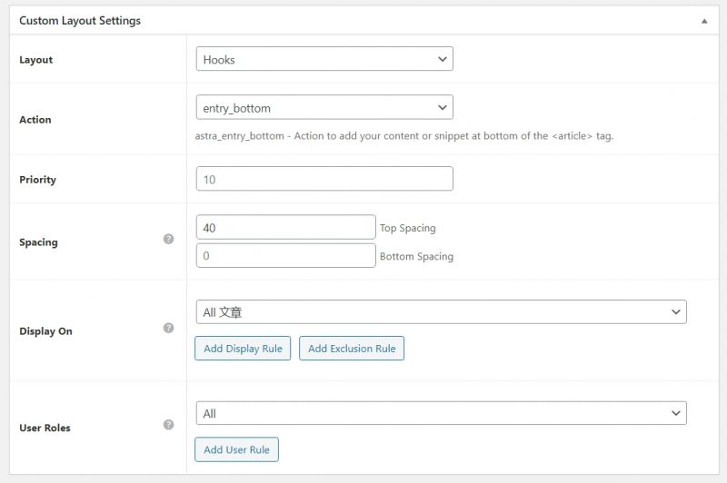 然后设置Hooks选项,重点是 Action 和 Dispaly 两个选项,分别代表显示位置和显示的范围,比如你可以设置显示在内容前还是内容后,设置在所有文章页或特定页面显示等,更多可以参考Astra Hooks教程