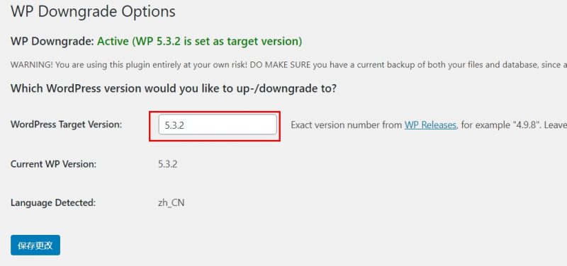 在插件中只有一个选项,就是WordPress的目标版本,你需要将其修改为要切换的版本,可以在Releases 页面查看所有版本