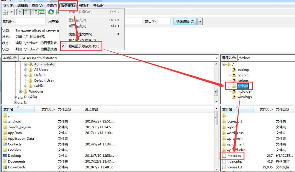 .htaccess文件在哪里?以FileZilla软件设置为例: