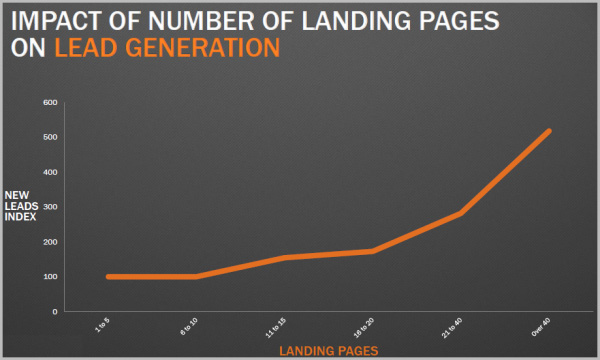 从上面的图中,我们可以清晰地看到Landing page从1~5个增加到6~10个,Leads(潜在客户)没有什么变化,但当Landing Page到10~15个的时候,Leads(询盘)增加了55%。随着Landing Page的不断增加,Leads(询盘)也在一直增加。