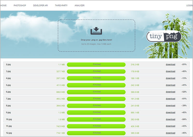 TinyPNG是May经常使用的一款压缩图片的工具,支持压缩.png和.jpg格式的图片,免费版一次最多支持20张图片,每张图片的大小限制在5MB以内。足够让你使用哦。可以自由拖动N(小于20)张或使用上传按钮,只要图片被添加,就会一个接一个地上传图片并自动进行优化。对于每个图片,你还可以看到图片的压缩比例,超级好用的哦。甚至很多大神都强烈推荐。