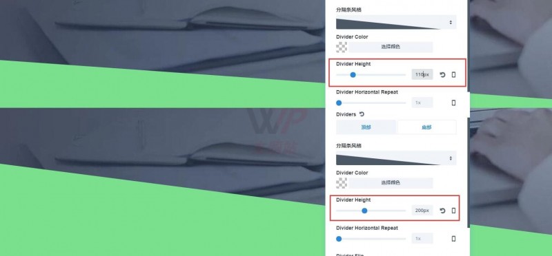 在选定风格后还可以进一步设置分割部分的高度,可以看到如下图中的Divider Height不同,网页图像的分割倾斜角度会有不同
