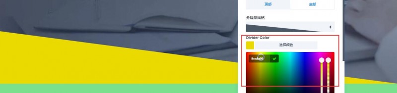 可能有朋友会说分隔器的颜色怎样调整呢,Divi是非常智能的,默认情况下,divider color是根据分隔器相邻的部分背景颜色自动生成的,一般斜线分割的网页都是这样设计的,当然如果你不需要这样的话,也可以自己单独调整背景颜色