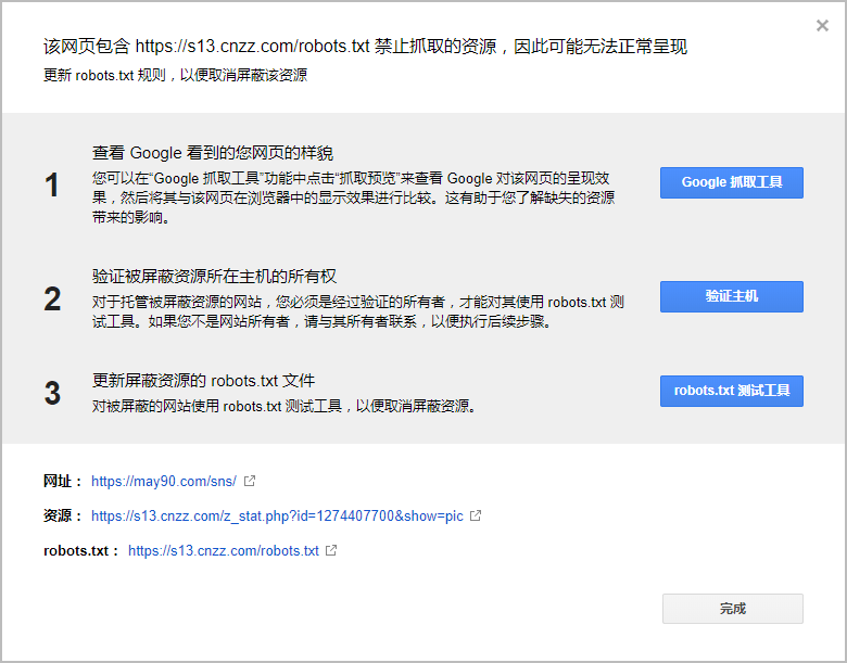 从Google Search Console的官方文档中不难理解,MAY博客安装了CNZZ,博客上的一些资源被托管到了CNZZ。而CNZZ的robots.txt禁止所有搜索引擎抓取所有网页资源,从而影响到了Googlebot抓取MAY博客上的资源。所以May彻底舍弃CNZZ。