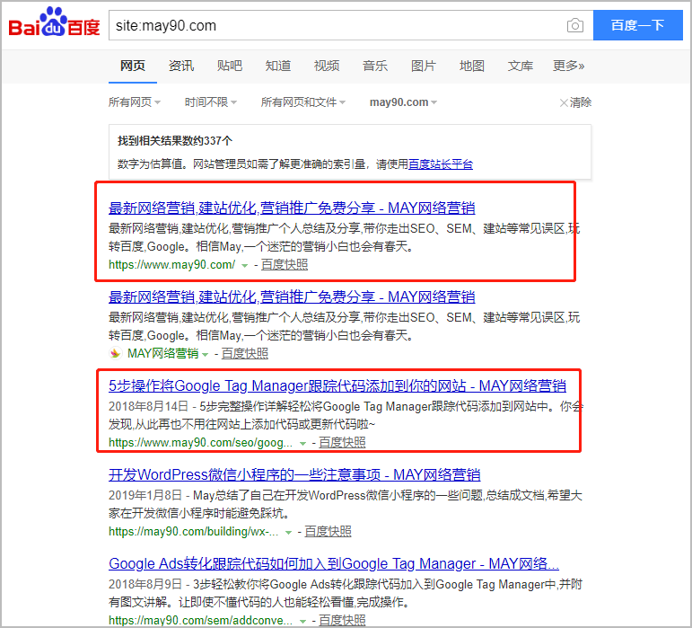 May之前有分享过一篇文章《如何禁止百度收录非首选域》, 但测试下来这种方法只适合新站点,像已经运营好几个月的MAY的SEO博客还是无法彻底屏蔽非首选域,百度同时收录了我的www站点和不带www的站点,不同的URL,确是同样的内容,在SEO优化领域被视为重复页面。May在网站建设初期就已经设置了301跳转,将带www的跳转到不带www的may90.com,但是百度还是完全忽视了。请看下图site结果,带有www的这两条收录记录怎么看着都不爽。