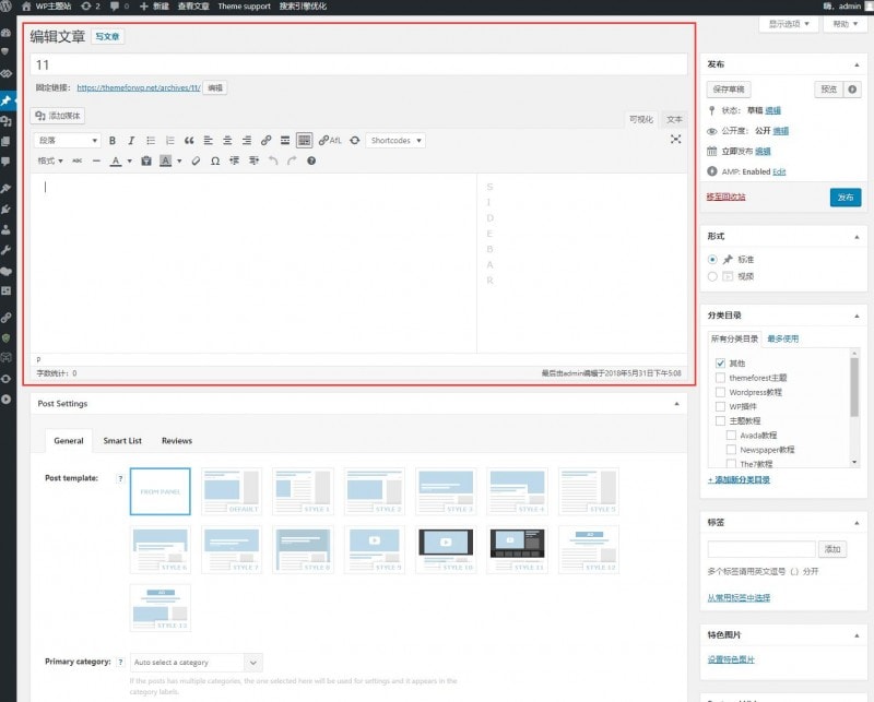 首先要知道Wordpress后台界面组成,最重要的地方就是红框部分,这里是文章内容,是必须的部分,也是唯一不能修改的区域,因为无论做什么,文章的内容总是要有的