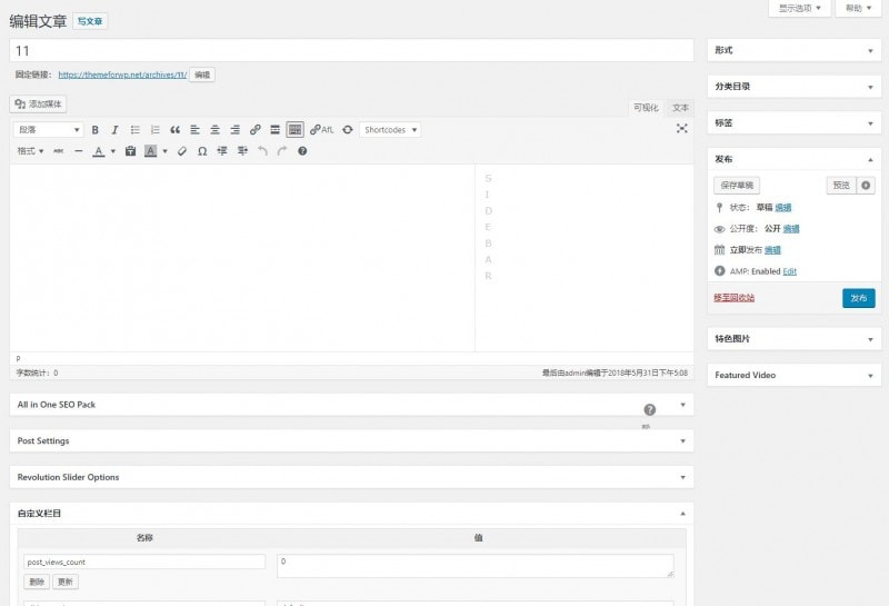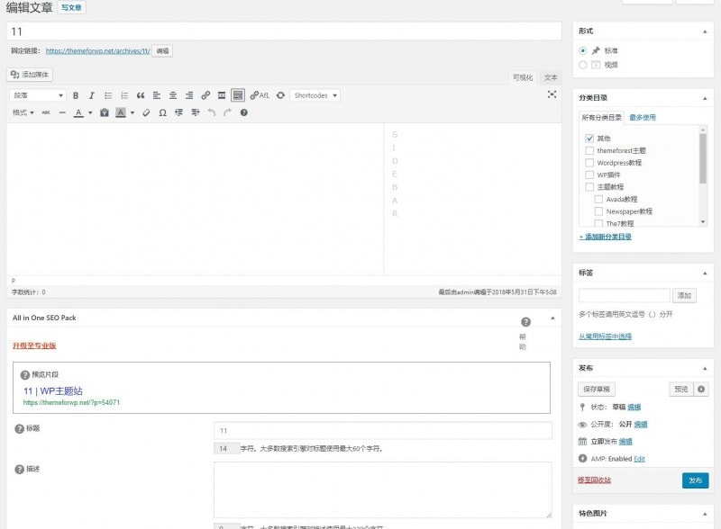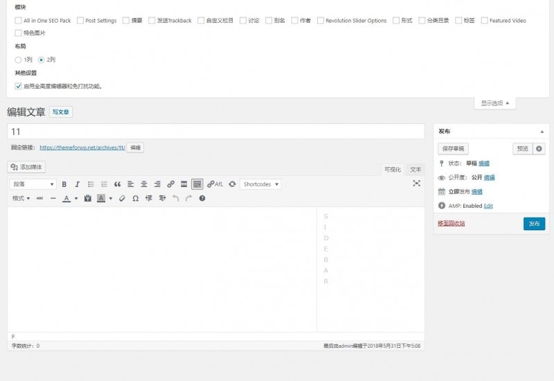 剩余的区域则都是可以定制的,可以用鼠标拖拽更改其位置,就像在可视化编辑器中布局那样简单,比如这里我将Seo选项放到了文章下边,把发布按钮放到右下角,只需要简单拖拽就行,自动保存布局