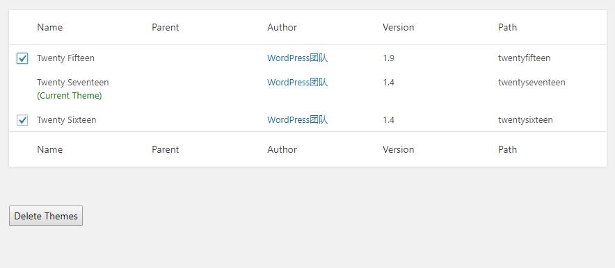 在这里会以文字的形式列出所有安装好的wordpress主题,并且为非激活主题提供删除选项,只需要选中要删除的主题就可以一键删除